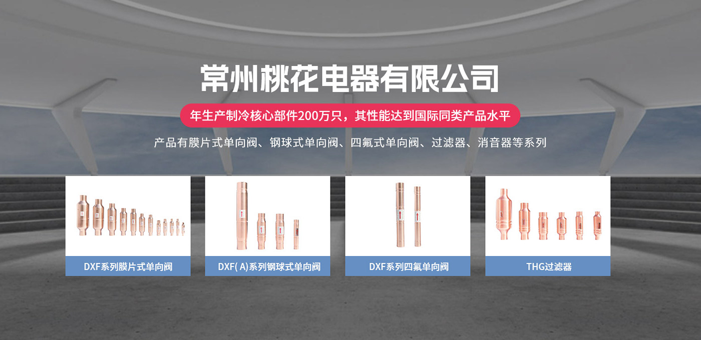 常州桃花電器有限公司地處中國長江“金三角”之稱的上海至南京高速公路、城際高鐵、常州高新經(jīng)濟技術(shù)開發(fā)區(qū)路段,交通便利、技術(shù)力量十分雄厚。它是集研究、開發(fā)設(shè)計、制造和經(jīng)營制冷核心部件的企業(yè),主要生產(chǎn)中央空調(diào)上使用的制冷部件。產(chǎn)品有膜片式單向閥、鋼球式單向閥、四氟式單向閥、過濾器、消音器等系列。年生產(chǎn)制冷核心部件200萬只,其性能達到國際同類產(chǎn)品水平。 企業(yè)擁有先進的科學(xué)技術(shù)、國際先進的生產(chǎn)加工設(shè)備和精密的檢測儀器,并已通過ISO9001質(zhì)量體系及CE認證,公司歷史悠久,2000年起,經(jīng)過長期積累、沉淀,經(jīng)驗豐富,從而保證了產(chǎn)品的高質(zhì)量、高性能、高耐用性。企業(yè)產(chǎn)品在國內(nèi)外市場具有較高的知名度,深受眾多中外品牌制冷客商的好評。主要客戶有約克、麥克維爾、美的、開利、特靈、頓漢布什、清華同方、天加等.并出口北美、歐洲、東南亞等地區(qū)。 高品質(zhì)產(chǎn)品是企業(yè)的保證,周到服務(wù)是合作友誼的承諾,企業(yè)本著“求
